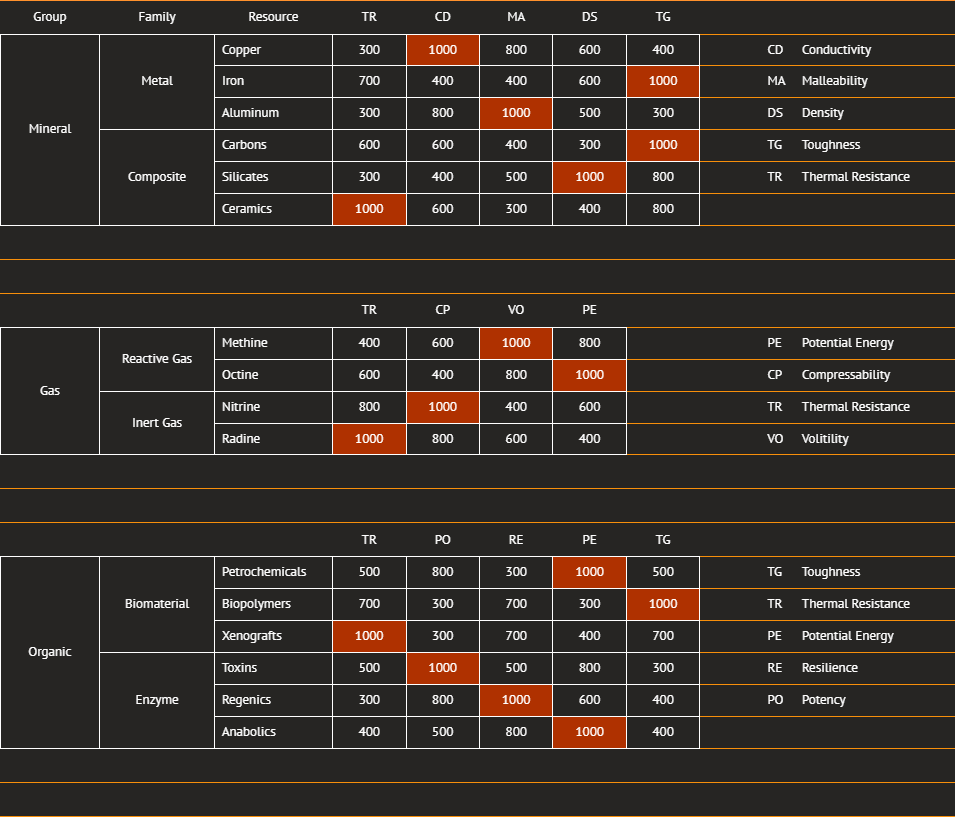 As you can see here each of the resource Groups also have specific properties. Minerals have Density, Conductivity and Thermal Resistance for example. Most of these properties are unique to each Group but some transend multiple groups such as Thermal Resistance. All resources will also specialize in one specific property which will often make them the 'best' for making items that require that property. In the Metals family Copper is the best Conductivity but Iron has the highest potential for Toughness. If an item you are making requires both Toughness and Conductivity then you will not be able to simply make a decision based upon the maximum possible value for each property, you will need to check to see what resources are available and which have the highest total for both of these properties. It is entirely possible for Iron to appear on the server with a value of 0 for Toughness and Copper to appear with a value of 200. This would therefore mean the 'best' resource for making that specific item at the time is actually Copper.